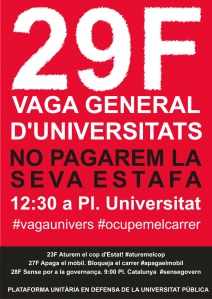 El proper dimecres 29 de Febrer la PUDUP (Plataforma unitària en defensa de la Universitat pública) ha convocat una manifestació en defensa de la universitat pública dintre de la Vaga General d’Universitats.