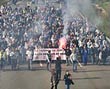 Tras los cortes de carretera de ayer, los trabajadores han atacado con vallas, piedras y bengalas la sede central de la multinacional tras la presentación del ERE.