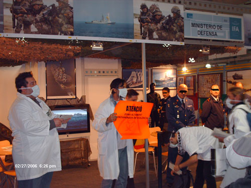 L@s antimilitaristas se limitaron a desplegarse frente al stand del Ministerio de Defensa sin penetrar en él, vestidos con monos blancos y protegidos con mascarillas. Al tiempo que coreaban consignas como “No te dejes infectar por el virus militar”, “disparar y matar no es trabajar”, “ningún ejército defiende la paz” o “gastos militares para escuelas y hospitales”, repartían material divulgativo entre los numerosos jóvenes que se acercaban. En la escenificación de la “desinfección del virus militar” se balizó simbólicamente la zona infectada y se colocó un cartel que rezaba “Peligro: zona altamente contaminada de violencia”, al tiempo que uno de los antimilitaristas, provisto de una máscara de gas y un pulverizador se dedicaba a rociar con agua supuestamente desinfectante todas las proximidades del stand y a las personas que se acercaban.