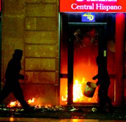 "El portavoz del equipo de gobierno municipal, Ferran Mascarell, ha valorado inicialmente los desperfectos provocados ayer por un grupo de manifestantes okupas en 200.000 euros". (...) "Además de las múltiples pintadas en Via Laietana, las calles Jaume I y Ferran, y en la plaza Sant Jaume, Mascarell ha destacado los destrozos provocados en un bar de la plaza Sant Jaume, en un semáforo -que fue arrancado-, en el pesebre municipal, en las sucursales del Banco Central Hispano (BCH), del Banco Bilbao Vizcaya Argentaria (BBVA), de Caixa Tarragona y de Caixa Laietana, en todas las papeleras de la calle Ferran -que fueron incendiadas-, en el establecimiento Mc'Donalds y en las cabinas y el mobiliario situado delante del Gran Teatre del Liceu, en Las Ramblas".[AFP]