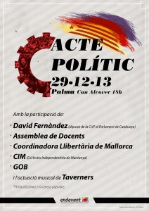 Ja són molts els anys que fa que dia 30 de desembre prenem els carrers, sota la consigna de defensa de la nostra terra, però també dels nostres drets socials i de gènere. La Diada d’enguany ve marcada per l’escalada dels atacs del PP contra el nostre poble i una mobilització popular sense precedents en la nostra Història. Tota aquesta energia va sorgint a tots els pobles de l’illa i és per això que enguany hem treballat conjuntament amb multitud de col·lectius locals per a organitzar actes a diversos indrets de Mallorca. Pel que fa a la manifestació, enguany hem decidit desvincular-mos de la plataforma 31D per tal d’impulsar un espai més afí a la nostra línia política, fent un pas endavant amb la construcció del nostre projecte basat en la Unitat Popular.