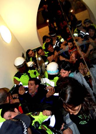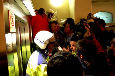 El grupo ha conseguido que el pleno del ayuntamiento escuchara sus protestas y en un gran ejercicio democrático la alcaldesa ha suspendido la sesión. Antes y durante, la policía local no ha podido impedir ni por la bastante lo adelanto de la gente. Por primera vez se ha visto a agentes de la policía local con cascos y escudos antidisturbios.