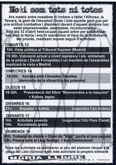 Des de l'Assemblea de suport seguim denunicant l'acusació abstracta que imputa a la Núria sense cap prova ni fet imputable. Això evidencia el fet que es jutgen i condemnen idees, maneres de viure que poden fer trontollar el sistema d'estat en el qual vivim.