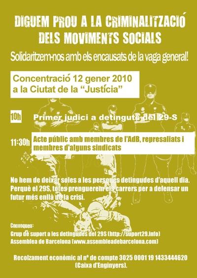Concentració 12 gener 2011 a la Ciutat de la “Justícia”: 10.00h. Primer judici a detinguts del 29-S.