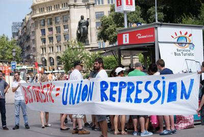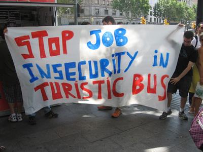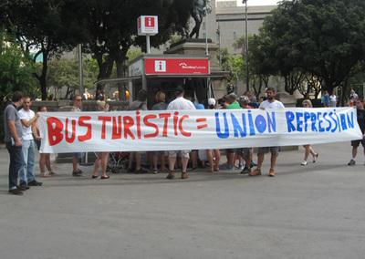 Durante la mañana del pasado sábado 7 de agosto, la CNT-AIT de Barcelona se concentró en los puntos de venta de billetes del Bus Turístic en Plaza Catalunya para protestar una vez más contra las condiciones de precariedad que rigen entre los trabajadores del servicio.
