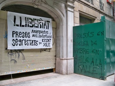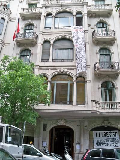 Ayer jueves 28 de abril en la ciudad de Barcelona, un importante grupo de individuos solidarixs, llevamos a cabo una okupación del Consulado de $hile, con el propósito de hacer llegar un mensaje al Estado terrorista de $hile. Básicamente exigimos el envío de faxes al ministerio del interior, Ministerio de Justicia, de relaciones exteriores y a la prensa burguesa de $hile. Además se colgaron dos pancartas en el frontis del edificio, mientras lxs compas que estaban afuera cortaron la calle y se gritaron proclamas por la libertad de nuestrxs compas presxs.