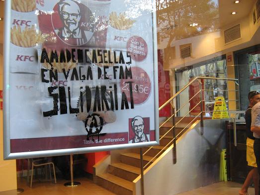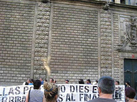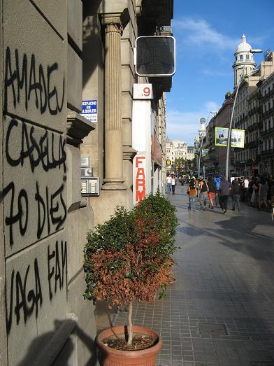 19:00 La manifestación sigue bajando por Las Ramblas, realizándose pintadas en edificios públicos, locales comerciales y entidades bancarias exigiendo la libertad de Amadeu Casellas. Las Ramblas están muy concurridas de gente, a quienes se está informando de la grave situación de Amadeu.