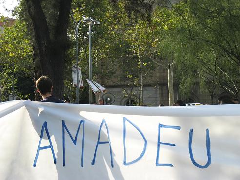 17:20 Alrededor de cien personas se han concentrado para mostrar su apoyo y solidaridad con Amadeu y pedir su libertad. La presencia policial por el momento no es muy fuerte aparentemente. Comentar que la abogada ha podido entrar a ver a Amadeu y pasarle la ropa (esa que "accidentalmente" se manchó de jabón). Ha encontrado a Amadeu bastante despierto, se mueve, se levanta y se encuentra animado.Ha empezado a tomar azúcar (no glucosa) y su decisión es firme en seguir hasta el final y agradece el apoyo que le llega desde todas partes (dentro y fuera del estado.