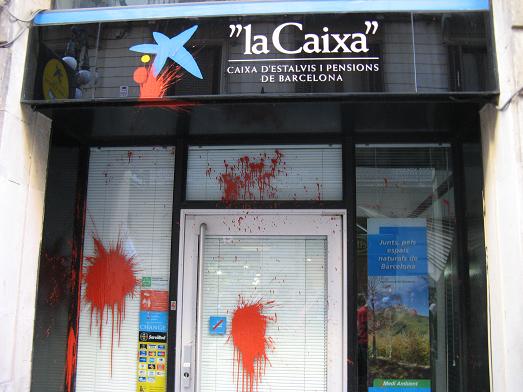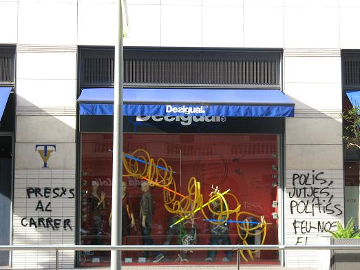 18:10 La manifestación ha comenzado y se ha cortado la calle y se dirige hacia Plaça Catalunya.Se están repartiendo comunicados y se realizan pintadas en locales comerciales y bancarios.