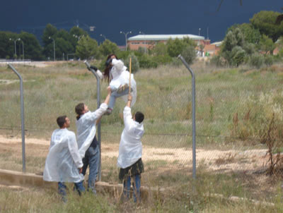 Poco después de la división en grupos de afinidad, se han empezado a producir intentos de entrada a lo largo del perímetro militar junto a la carretera de Olocau. Poco antes de llegar a la salida de vehículos de la base, a la altura de las instalaciones de la Unidad Militar de Emergencias, se ha producido la entrada de personas de diferentes grupos de afinidad. Algunas han sorteado las dos vallas metálicas pasando por debajo, aprovechando su holgura. Otras, han trepado y pasado entre los alambres de espino que coronan las vallas, descolgándose del otro lado. En total, 10 personas han conseguido traspasar el perímetro de seguridad y acceder a la zona de las instalaciones.