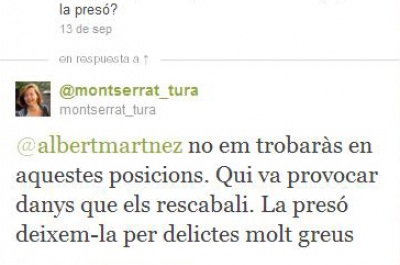 Se da la circunstancia de que algunos de los citados a declarar ya manifestaron en su momento que se mostraban contrarios a la existencia del propio organismo de la Audiencia Nacional o que se utilizara para casos relacionados con el movimiento de los indignados. Así lo dijeron públicamente Montserrat Tura del PSC, Salvador Milà de ICV y Alfons López Tena de Solidaridad por la Independencia. Montserrat Tura, a preguntas de un periodista de este semanario (imagen) el pasado 13 de septiembre dijo literalmente: "no me encontrarás en estas posiciones. Quién provocó daños que los repare. La cárcel dejemosla para delitos muy graves". Ahora será la misma Tura quien podrá explicar al juez Eloy Velasco su postura contraria a penas de prisión por los hechos del Parlamento.