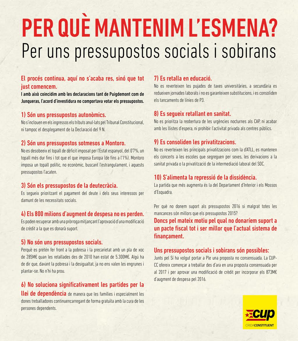 La CUP ha hecho público un decálogo con sus razones por las que vetan los presupuestos. Consideran, entre otras cuestiones, que son unos presupuestos autonómicos, sometidos a Montoro, donde se consolidan las privatizaciones, se recorta en sanidad y educación y se alimenta la represión a la disidencia.