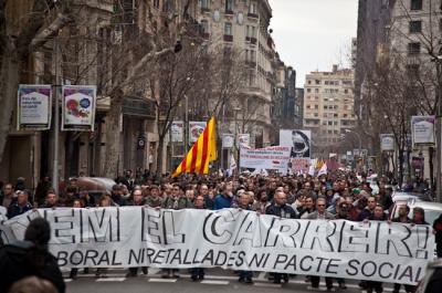 Entre las 11 y 12hs de la mañana de ayer domingo se dieron cita más de 150.000 personas en varios puntos del centro de la ciudad según algunas fuentes (como La Directa, que habla de 160.000), o 400.000 según sindicatos. Los motivos son muchos, aunque el principal es la actual Reforma Laboral que está llevando a cabo el gobierno del PP. Entre otras cosas, esta consiste en el abaratamiento del despido, el contrato de formación y aprendizaje que se amplia hasta los 30 años, el de por tiempo indefinido (además, en las empresas con menos de 50 trabajadoras el periodo de prueba será de un año -con el que se puede despedir sin indemnización alguna-). Además aumentará la flexibilidad interna de las empresas en donde desregularizan las jornadas laborales o las categorías profesionales o se da prioridad total al Convenio de Empresa sobre el de ámbito superior, es decir, las condiciones las impone el empresario. También, las personas que cobren la prestación por desempleo podrán ser llamados para realizar “servicios de interés general en beneficio de la comunidad“, o lo que es lo mismo, realizarán trabajos forzados ya que la prestación por desempleo es parte de las retenciones del salario de trabajos anteriores. Además, esta media es muy contraria a eso que llaman "crear empleo". Así mismo, se refuerza el papel de las ETT como oficinas de colocación, es decir, se privatiza es Servicio Público de Empleo, se podrán realizar horas extraordinarias en los contratos a tiempo parcial, etc.