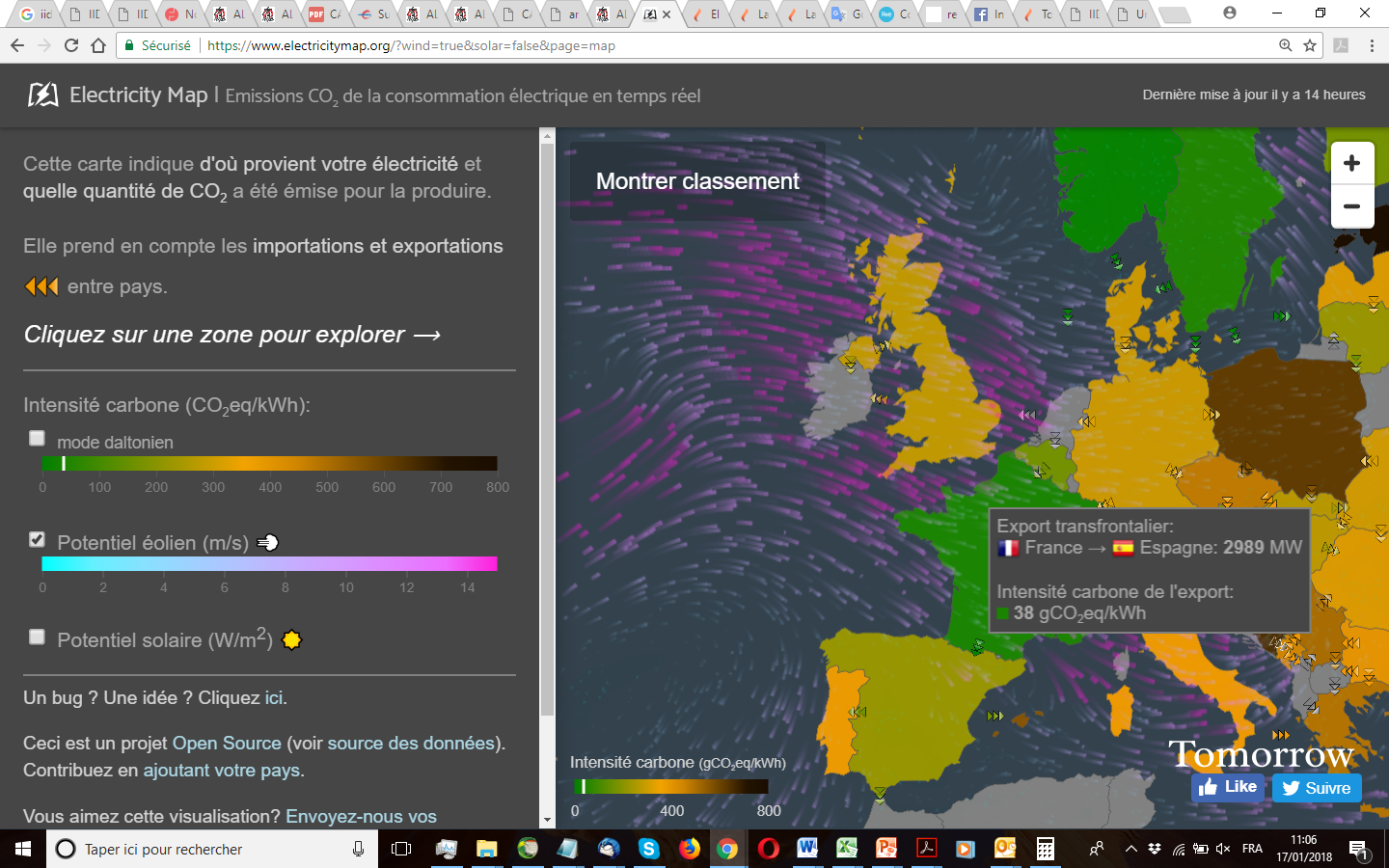 En 2017, España importó desde Francia 16.400 GWh (+152% desde 2014) o, lo que es lo mismo, el 6% del consumo eléctrico total de España (o el 23,5% del consumo residencial, o el 21% del consumo eléctrico del norte de España, o el 100% del de Euskadi en 2015). Este mismo año, España exportó a Francia solo 2.800 GWh (+16% desde 2014), o solo el 4% del total de lo generado por las renovables en España.El pasado miércoles 17 de enero, a pesar del fuerte viento y de la alta generación eólica (hasta el 40% de la demanda, según Red Eléctrica de España), el oligopolio prefirió importar energía nuclear de Francia, desde 2.200 a 3.100 MW (o el 100% de la capacidad FR-ES disponible ese día, con una capacidad máxima sobrante de 3.500 MW), sin ninguna exportación, como puede observarse en el mapa interactivo https://www.electricitymap.org o en la web de IESOE, Interconexión Eléctrica del Suroeste de Europa: http://www.iesoe.eu (haced click en las siguientes capturas de pantalla de ambas webs).
