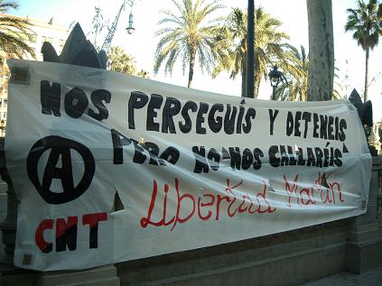 Según declaraciones de un compañero de la CNT de Joaquim Costa a la haine, Martín, un miembro de ésta organización, fue detenido por dos secretas el pasado miércoles 12 a las 8:30h cuando procedía a abrir la libreria que se encuentra en el local de la CNT. A partir de ese momento fue trasladado a la comisaría de Les Corts, donde ha permanecido hasta esta mañana. La abogada intentó reunirse con él en comisaria pasadas unas horas desde su secuestro, pero no le fue permitido, por motivos de "seguridad". Al final, logró encontrarse con él ayer, jueves 13. Martín decidió no declarar en comisaría y hoy ha sido puesto a disposición judicial.