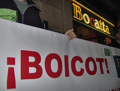 Al comienzo de la concentración se ha logrado vaciar el local, y al ser una zona muy céntrica está teniendo una gran difusión. Se ha repartido a los trabajadores y a toda persona que pasaba el comunicado realizado por el colectivo de trabajadores de Bocatta, y se ha llenado tanto la entrada del establecimiento, como las inmediaciones del mismo, de pegatinas en las cuales se llama al boicot a Bocatta. Tras una hora de concentración, se ha leido el comunicado, y se ha desconvocado la concentración.