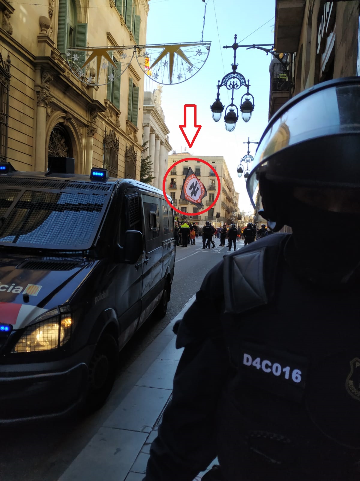 12:40h Nació Digital denuncia exhibición de simbología nazi-fascista en la plaza de Sant Jaume ante la pasividad policial. Los Mossos separan a los asistentes al acto del fascista Vox de lxs manifestantes Antifascistas.