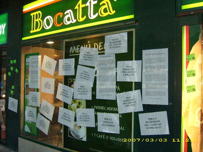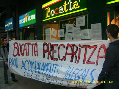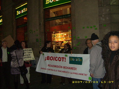 El pasado viernes 16 de marzo se celebraron diferentes acciones descentralizadas en 7 locales de la empresa Bocatta para pedir la readmisión de Mohamed, miembro del comité de empresa, despedido por poner en evidencia a la empresa al denunciar los contínuos ataques que ésta realiza contra los derechos de los trabajadores. La convocatoria de jornada de acciones descentralizadas fue apoyada convocada por el Colectivo de trabajadores y trabajadoras de Bocatta, y apoyada por la Xarxa contra els tancamens i la precarietat.