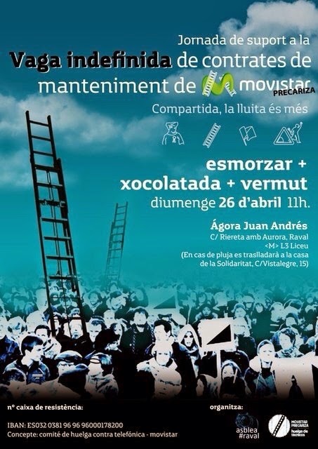 Chocolatada y Vermut solidarios con la huelga indefinida de técnicos movistar. Es en el Raval. Adjuntamos cartel