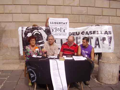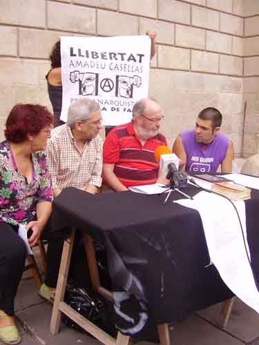 Esta mañana a las puertas de la Generalitat se ha presentado en rueda de prensa el manifiesto por la libertad del preso anarquista Amadeu Casellas. La rueda de prensa compuesta por Roser Iborra y Enrique Menasalvas, miembros de los grupos de apoyo, Jorge del Cura del Centro de Documentación contra la Tortura (CDDT) y Francesc Arnau, miembro del despacho de abogados DALP que se encarga de la defensa legal del preso anarquista, han expuesto bajo la mirada de varios medios oficiales que han acudido a la cita, la situación actual de Amadeu Casellas. Pese a que el pasado viernes Amadeu abandonó la huelga, los grupos de apoyo junto a su gabinete jurídico prosiguen con las movilizaciones velando por los compromisos acordados.