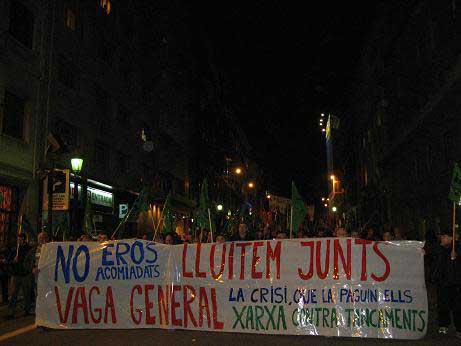 La manifestación, que ha comenzado a las 18h y que ha recorrido varias de las principales calles del centro de Barcelona hasta llegar a la plaça de la catedral, ha congregado a miles de personas. CCOO, UGT, y EUIA han hecho un despliegue mediático muy importante para copar las luchas de trabajadorxs de diferentes empresas de Catalunya.