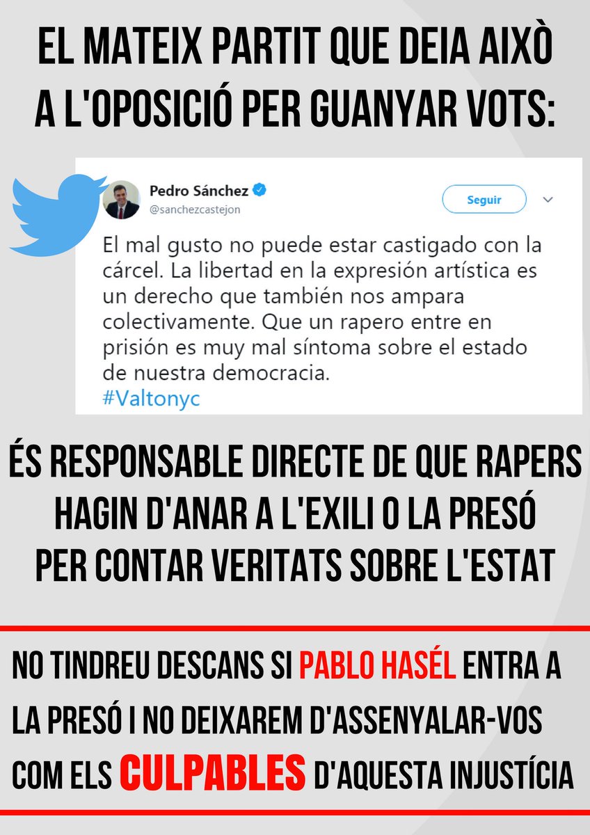 En la oposición Pedro Sánchez dijo que encarcelar a Valtonyc es "muy mal síntoma de nuestra democracia", pero como siempre, al llegar al gobierno sólo ofrecen represión por protestar con una rabia legítima ante los desahucios, el paro masivo, la explotación, la sanidad maltratada, etc. Por ello, nuestro compañero Pablo Hasel puede ser encarcelado más de 4 años en cualquier momento por unos tribunales fascistas herederos del TOP de Franco y sus verdugos.