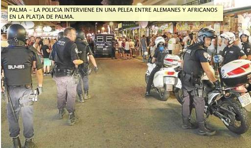 Una baralla entre joves alemanys d'ideologia neonazi i venedors subsaharians a Platja de Palma va finalitzar amb dos detinguts i una forta actuació policial. Els venedors nouvinguts s'haurien defensat de les agressions i vexacions dels neonazis, fet que va originar el tumult i la baralla.