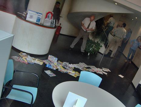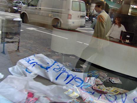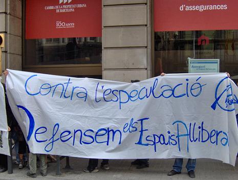 Según informaciones recibidas por la haine, un grupo bastante grande de personas han llegado a la entrada, han desplegado dos pancartas en la puerta, en las cuales ponía " contra l`especulació, defensem els espais alliberts" y "100 anys d'especulció. Ja tenim prou" ( 100 aos de especulación. Ya tenemos suficiente). En ese momento varios activistas han entrado en el hall del edificio y han llenado el suelo de revistas con información inmobiliaria, han derramado aceite por el suelo y por las paredes, han echado "mierda" por el suelo, y han obsequiado esta institución con una tarta con forma de "cagada" con unas velas y bengalas.